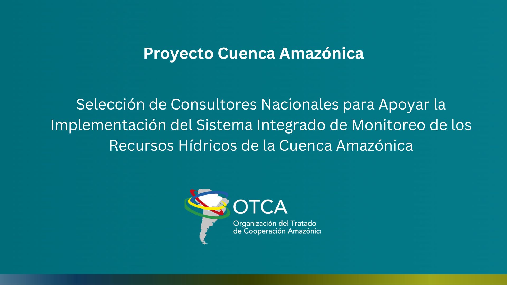 A través del Proyecto Cuenca Amazónica, la OTCA contratará consultores en los ocho países amazónicos para apoyar la gestión de información y datos generados mediante la aplicación de los Protocolos Regionales de Monitoreo adoptados por la Red Amazónica de Autoridades del Agua, en el contexto de la implementación del Sistema Integrado de Monitoreo de los Recursos Hídricos de la Cuenca Amazónica. Este sistema integrará las dos Redes Regionales de Monitoreo que operan en el Observatorio Regional Amazónico (ORA) de la OTCA: la Red Hidrológica Amazónica (RHA) y la Red de Calidad del Agua (RQA).