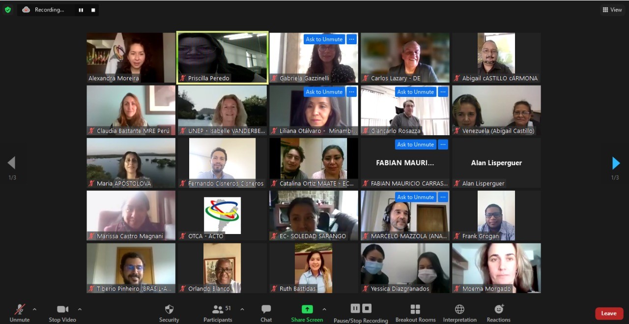 El evento virtual se llevó a cabo el 22 de septiembre al que asistieron los Puntos Focales Nacionales del Proyecto de los 8 Países Miembros de la Organización del Tratado de Cooperación Amazónica (OTCA), representantes de la Secretaría Permanente de la OTCA y de la Agencia Implementadora Programa de las Naciones Unidas para el Medio Ambiente (PNUMA).