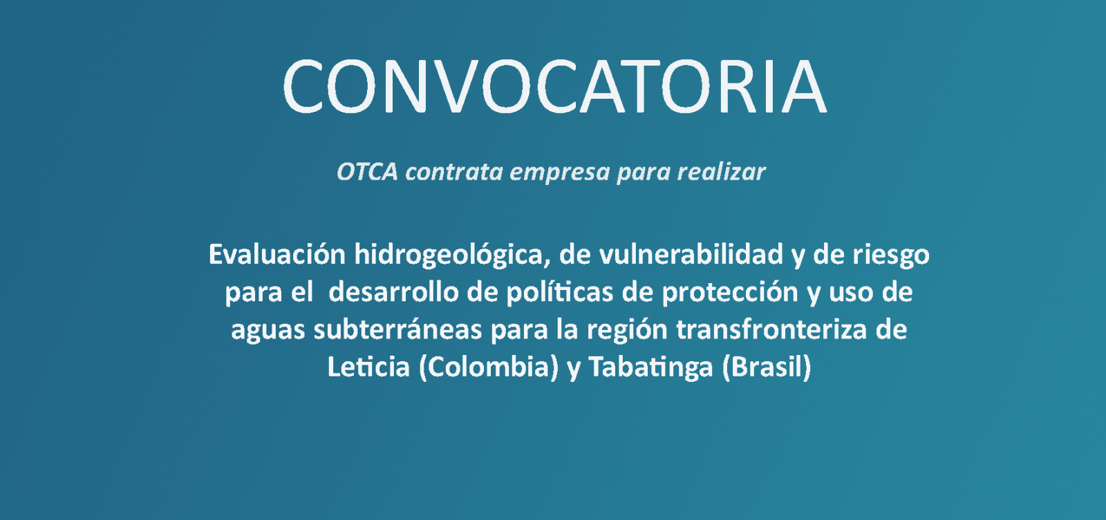 Las empresas interesadas en postular deberán remitir todos los documentos solicitados en formato digital, en español y/o portugués, a través del e-mail institucional: selecao@otca.org, indicando nombre del Proyecto y el Motivo de la Postulación [Proyecto Cuenca Amazónica – Evaluación hidrogeológica, de vulnerabilidad y de riesgo para el desarrollo de políticas de protección y uso de aguas subterráneas para la región transfronteriza de Leticia (Colombia) y Tabatinga (Brasil)].