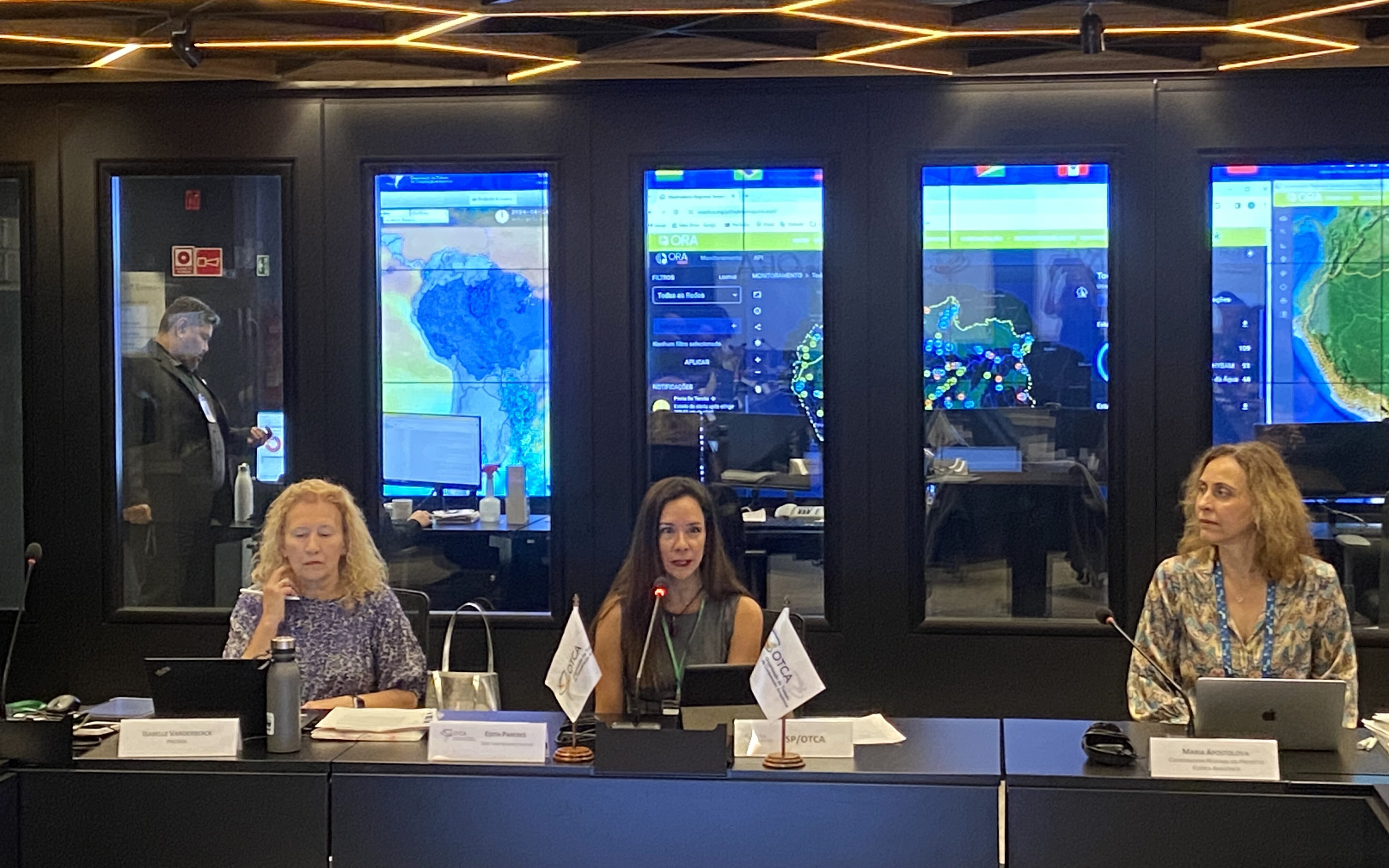 - A diretora Edith Paredes na abertura da COP. À sua direita, Isabelle Vanderbeck, gerente de programa do PNUMA. À esquerda, Maria Apostolova, coordenadora regional do Projeto Bacia Amazônica
