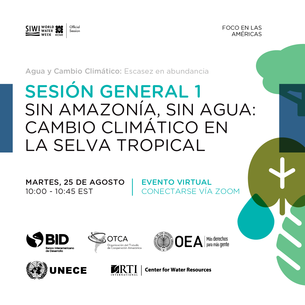 La sesiónSin Amazonia, sin agua: cambio climático en la selva será el martes 25 de agosto de 10:00 a 10:45 AM EST, en la plataforma Zoom. Se dispondrá de traducción simultánea al inglés, español, francés y portugués. Para unirse a este evento, regístrese en este enlace: https://www.worldwaterweek.org/event/9163-no-amazonia-no-water-climate-change-in-the-rainforest